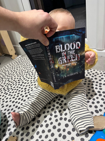 Jim’s trilogy), Baby Grundy slams her own book shut with a no-nonsense thump and points at my copy of Blood In The Green with a look of such determination that it’s clear counting sheep is beneath her.